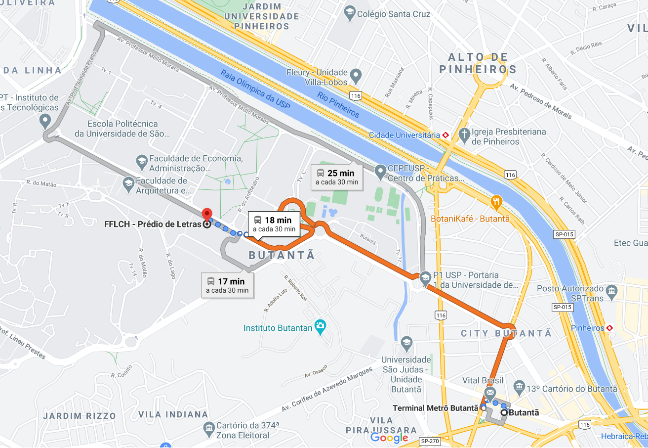 DIREÇÕES para o Prédio de Letras - Faculdade de Filosofia, Letras e Ciências Humanas (FFLCH) Pelo Metrô: Pegue a Linha 4-Amarela até a Estação de Metrô Butantã. Então, no Terminal de Ônibus atrás da Estação, pegue qualquer ônibus das linhas 8012-10, 8022-10, 177h, 701U-10 or 702U-10. Uma vez dentro do Campus da USP, desça no ponto História/Geografia ou Biblioteca Brasiliana, na Avenida Professor Luciano Gualberto. A entrada pricipal para o Prédio de Letras está a aproximadamente 50 metros à direita do Ponto História/Geografia se você estiver de frente para os prédios. Se você descer do ônibus no Ponto Biblioteca Brasiliana, atravesse a Avenida Luciano Gualberto na faixa de pedestres à direita (se você estiver de costas para a Biblioteca Brasiliana), e continue à direita na Avenida Luciano Gualberto por aproximadamente 200 metros. A entrada do Prédio de Letras estará à sua esquerda, indicada por uma placa.